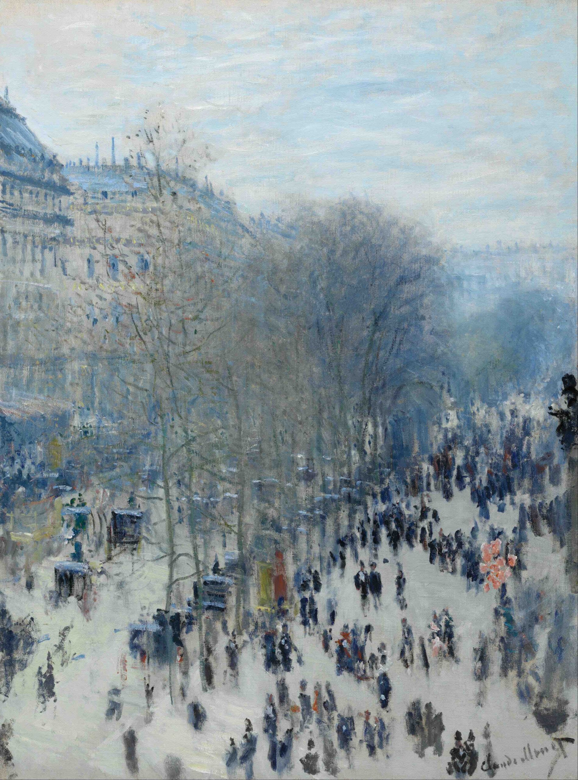 Claude Monet, Boulevard des Capucines, 1874. Impressionistien teoksissa nähdään ohikiitäviä hetkiä esimerkiksi väkijoukkojen vilinästä. Monet’n maalauksessa näkyy Boulevard des Capucines, jonka varrella sijainneessa valokuvaaja Nadarin ateljeessa pidettiin ensimmäinen impressionistien näyttely. Teos kuuluu Kansas Cityssä sijaitsevan Nelson-Atkins Museum of Artin kokoelmiin. Kuva: Wikipedia Commons.