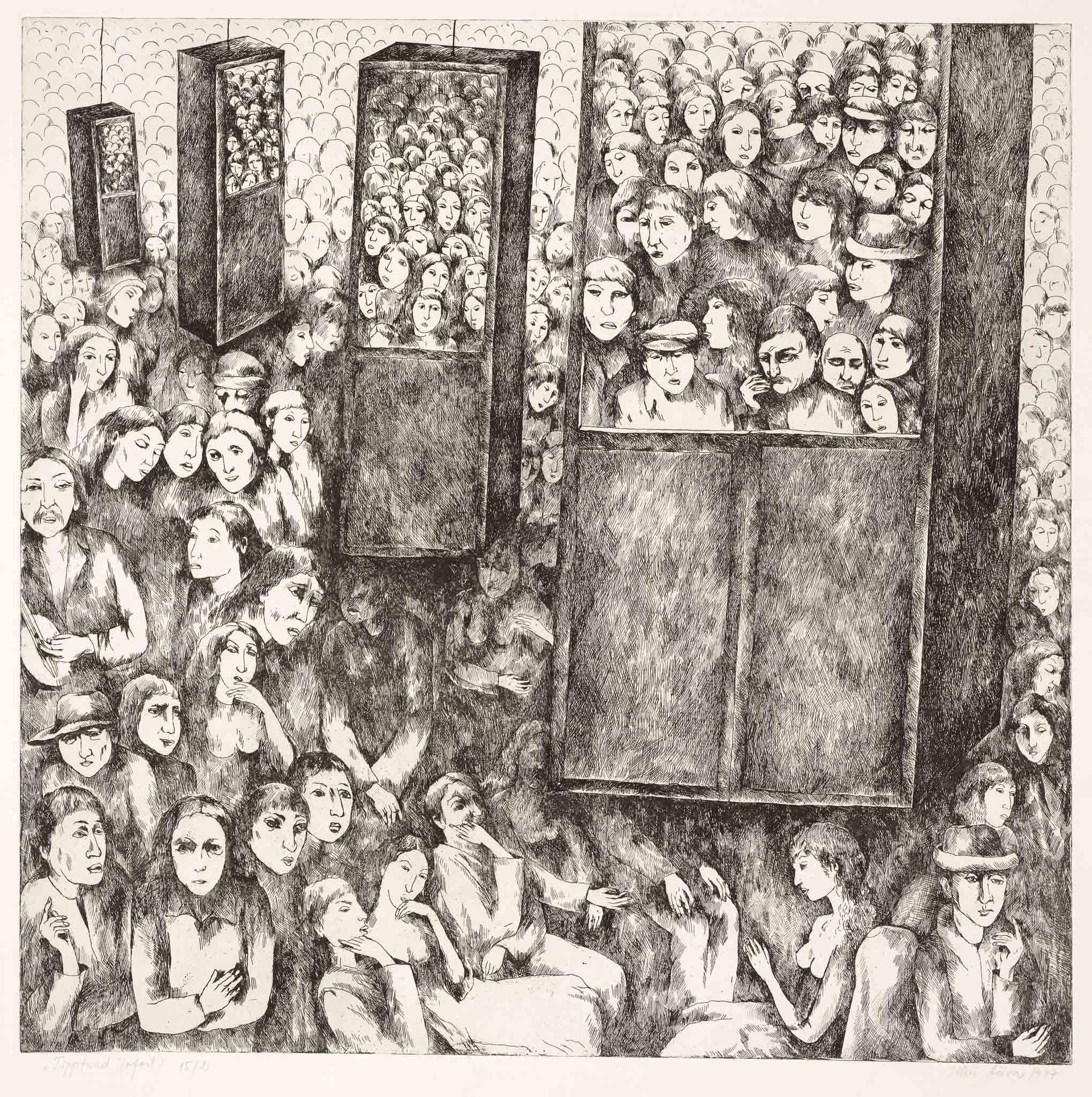 Silvi Liivan (1941-) kuvissa ihmiset on tyylitelty hellyttävän hauraiksi olennoiksi tiiviissä tunnelmissa. Ruuhka-aika, 1977, etsaus. Kuvat: Eesti Kunstimuuseum.