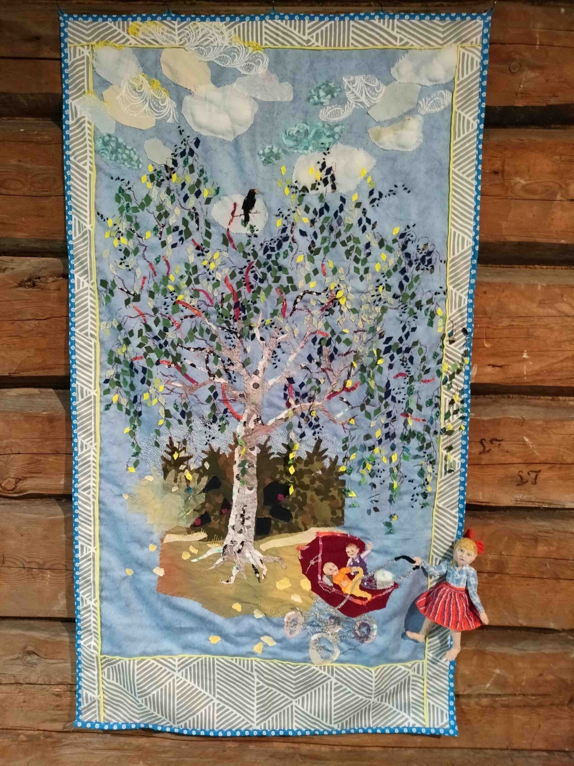 Jos nämä kaksi teosta ovat sävyltään synkähköjä, niin takaseinälle ripustettu seinävaate Mustarastas (2021) on luonteeltaan valoisa. Siinä kuvaan pyrkivä, lastenrattaita työntävä kansallispukuhameinen tyttö/nainen tuo mieleen Sakari Topeliuksen kansallisromanttisen sadun Koivu ja tähti. Sadun kotiin idästä pyrkivät poika ja tyttö makaavat Turakka Purhosen teoksessa lastenvaunuissa.