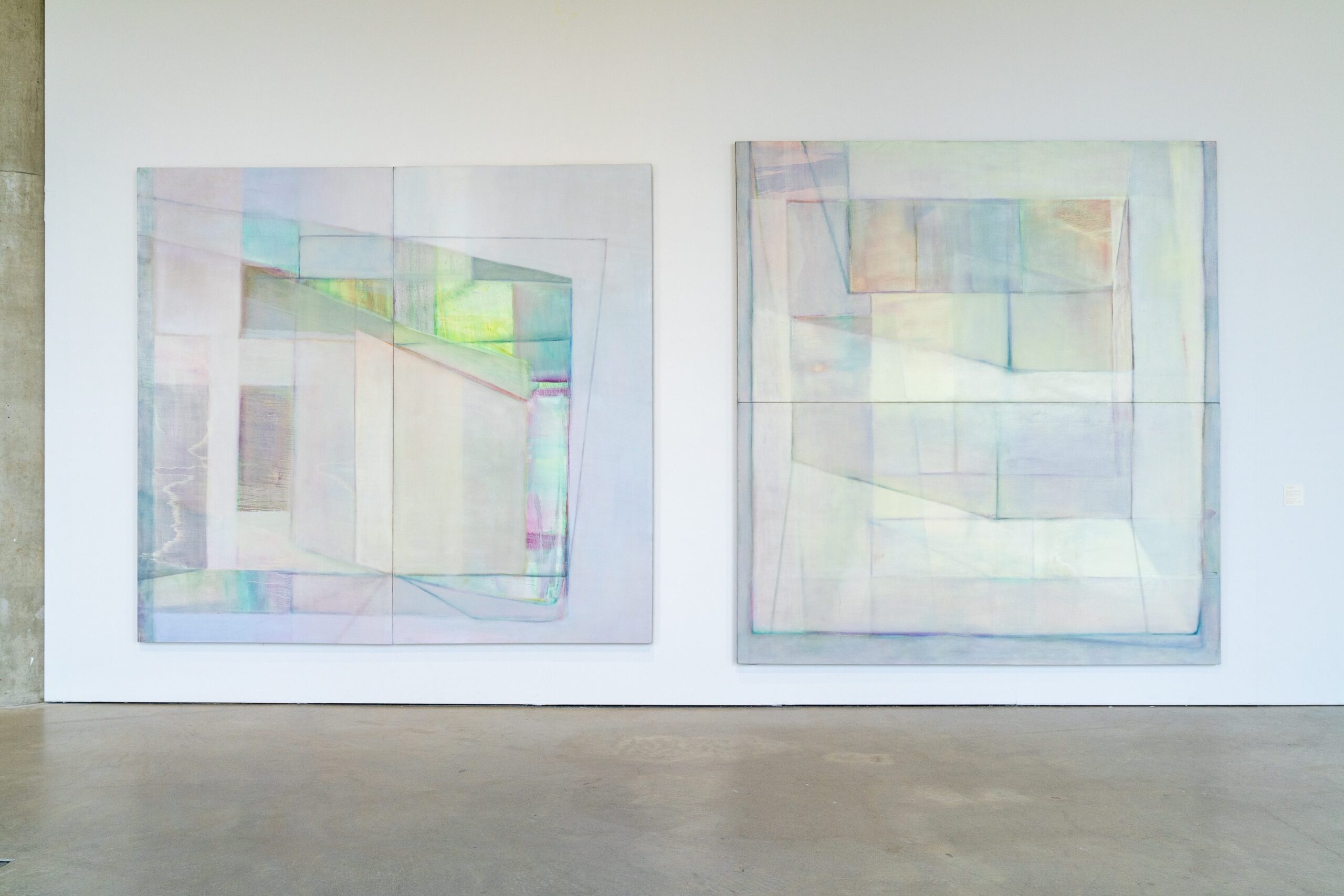 Onni Alanko, everything was still in flux, 2024, öljy pellavalle 240 x 260 cm ja thinking of a place, 2023, öljy pellavalle, 260 x 240 cm. Kuva: Petri Summanen.