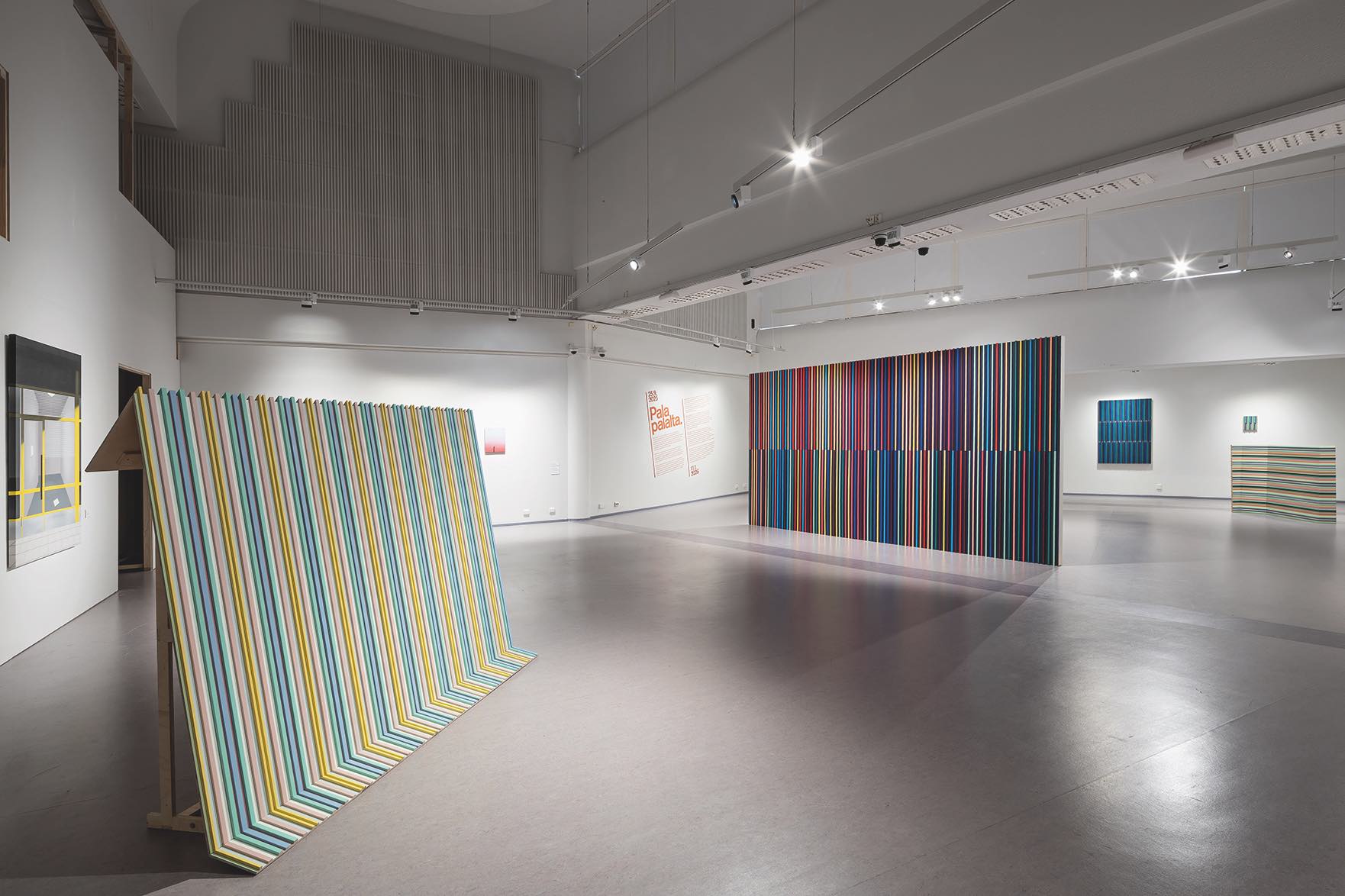 Jussi Juurinen, etualalla Peitto, 2023, vaneri ja kalustemaali. Hämeenlinnan taidemuseon kokoelma. Kuva: Aukusti Heinonen.