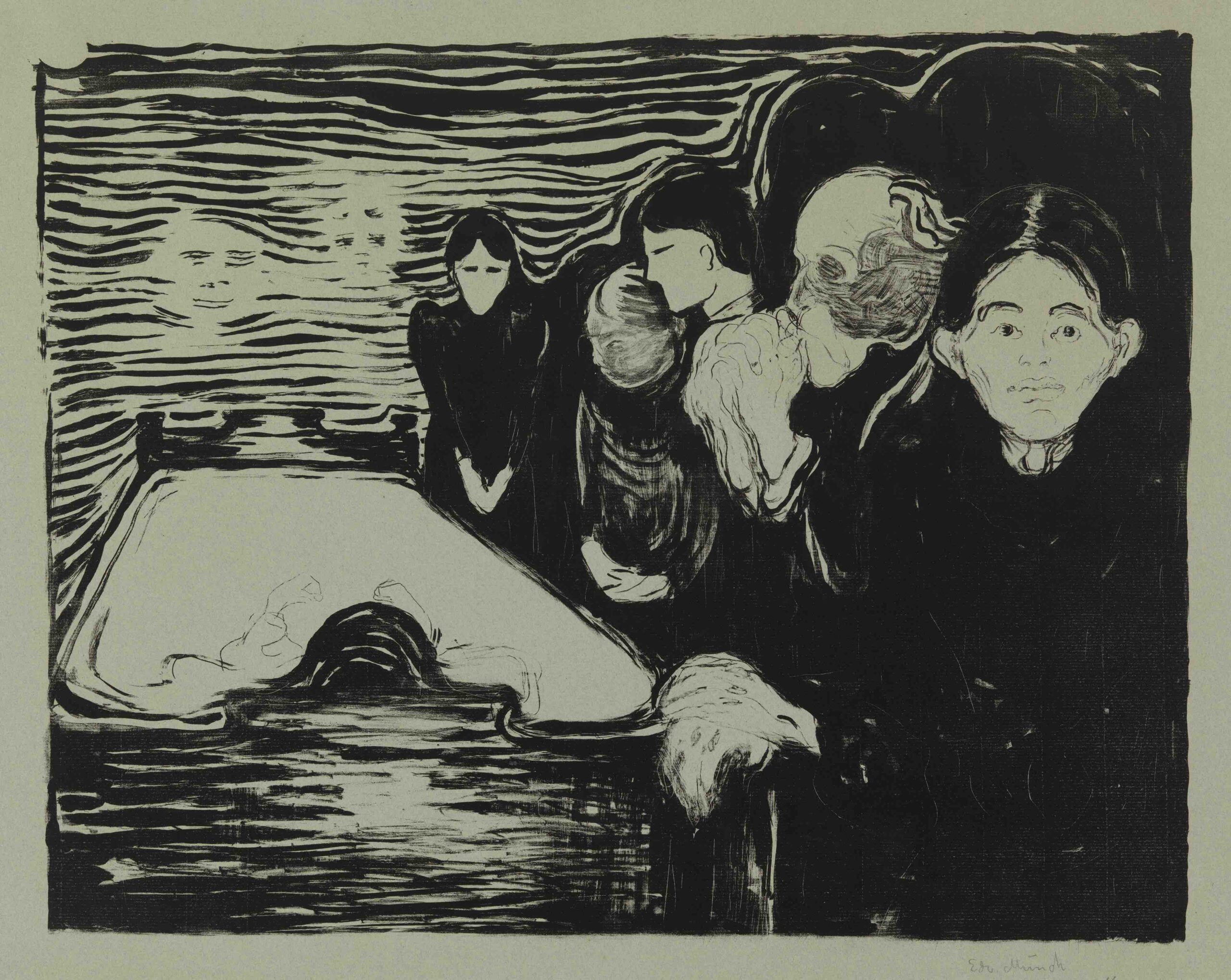 Edward Munch, Kuolinvuoteen ääressä. 1896, litografia ingres-paperille, 39,5 x 50 cm. Kansallisgalleria. Kuva: Aleks Talve