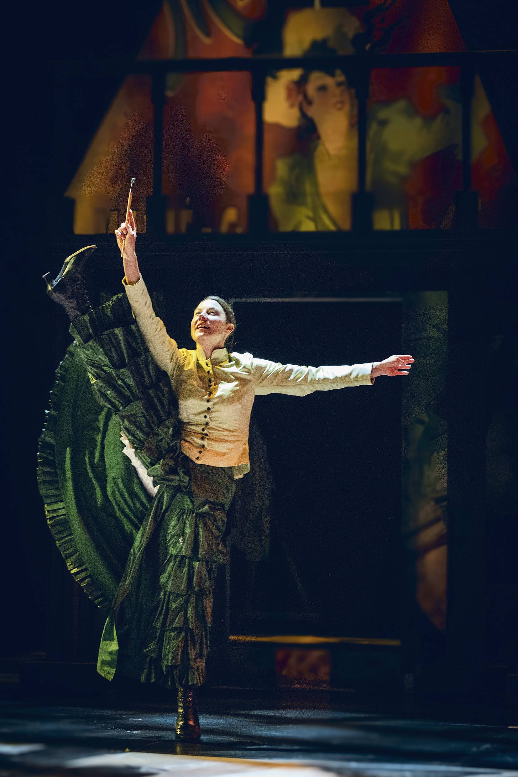 Taulun maalausprosessia on teatterissa hankala näyttää. Tässä se kuvataan Maiju Saarisen innoittuneella tanssilla.