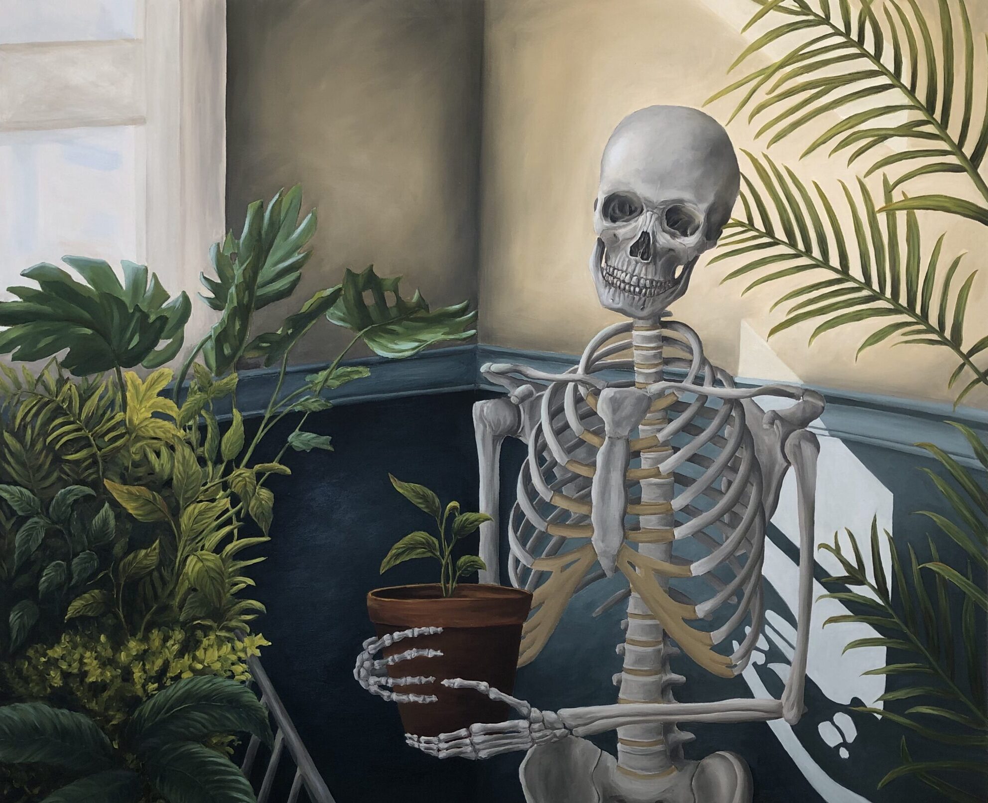 Kirsi Julkun Green Thumb luurankoja arkipuuhissaan kuvaavasta maalaussarjasta, joka tarjoilee sympaattisia uusasetelmia ihmisyydestä, mitä perinteisimmän maalauksen keinoilla. Interiöörimaalaus, kasveja, hoivaava olento, valonläikkä ikkunasta. Kaikki on kohdillaan – ja kuten Julku huomauttaa, luurangosta et voi nähdä sukupuolta. Chrysalis-näyttely.