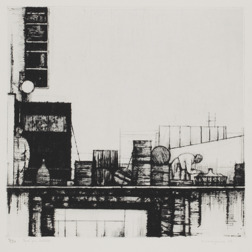 Pentti Kaskipuro, Maalaamaton silta, 1957, kuivaneula. Graphein-näyttely.