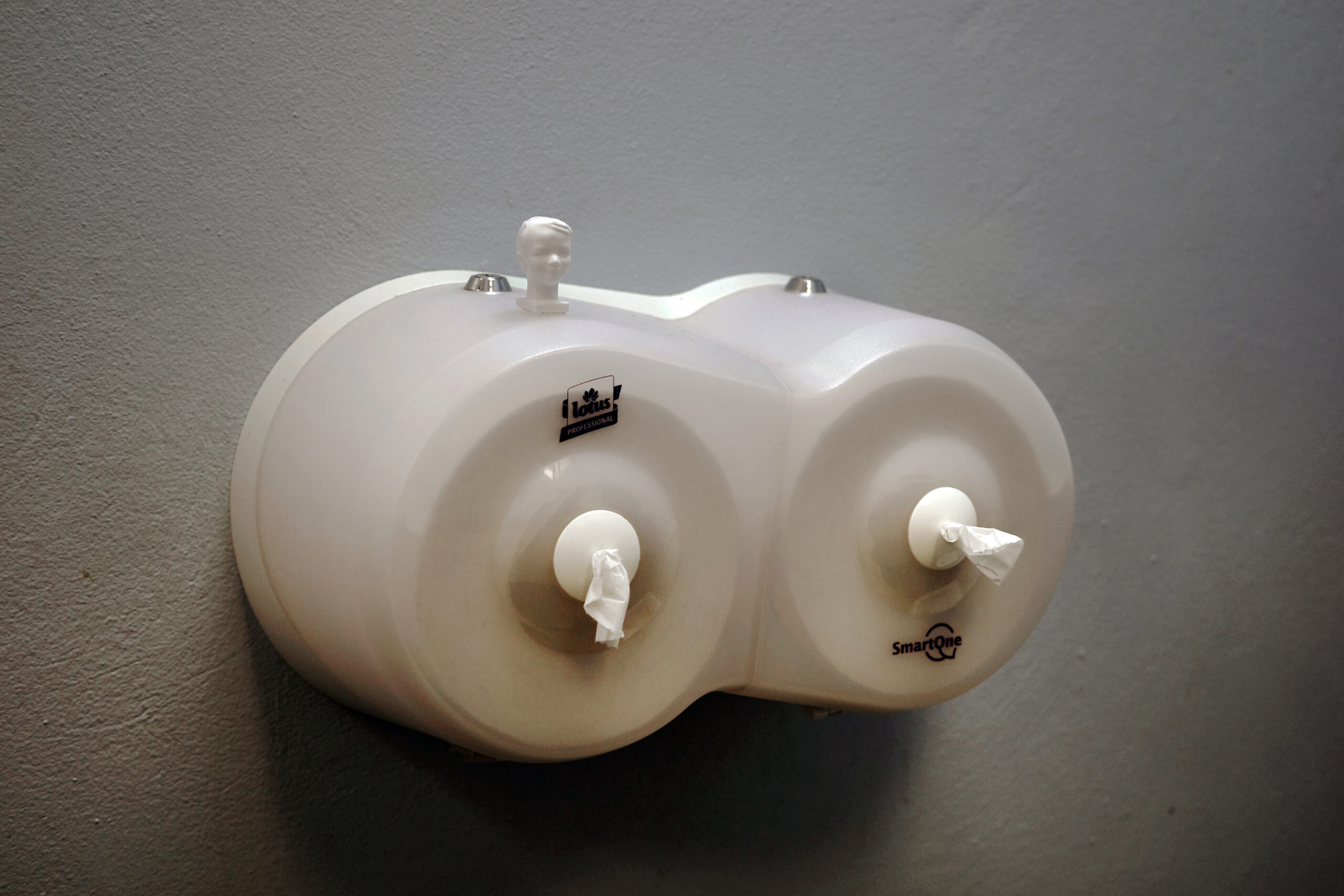 Hyvänä esimerkkinä kaupunkitaiteesta on Ekholmin Pikku-Kalle-niminen esineinstallaatio. Hymypoikapatsasta muistuttavat 75 erikokoista 3d-tulostetta alkoivat löytyä Kittilästä varsin nasevista julkisista paikoista, kuten kirkosta, kaupasta tai vaikkapa Teboilin vessasta, pöntön vieressä olevasta vessapaperitelineestä. Nyt teline on esillä kirjastossa ja sehän on kuin tissit, ja tissit kuin cumuluspilvet, joiden päällä hymypoika nyt huilailee autuas ilme kasvoillaan. Nänneistä ruutaava vessapaperi on valkoista hattaraa, ja Palsan Kalle, tuo seksuaalisen turhautumisen suurmestari, on taivaassaan.