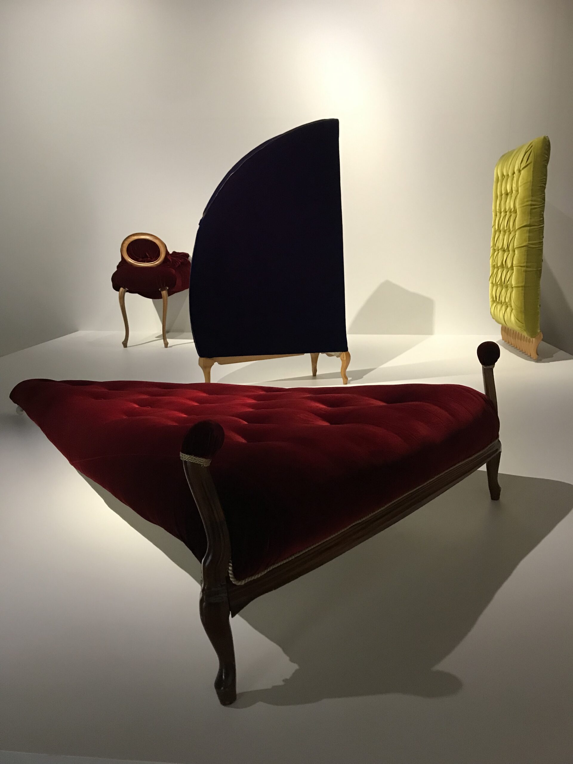 Huonekaluteoksiin ommeltuja nappeja tai pyöriä voi pitää vihjeinä naisellisesta käytännöllisyydestä, pukemisen ja riisumisen taidosta eli viettelystä. Barokin suureellinen mittakaava viehättää erityisesti teossarjassa SALONG 3+ Velvetti (1991).