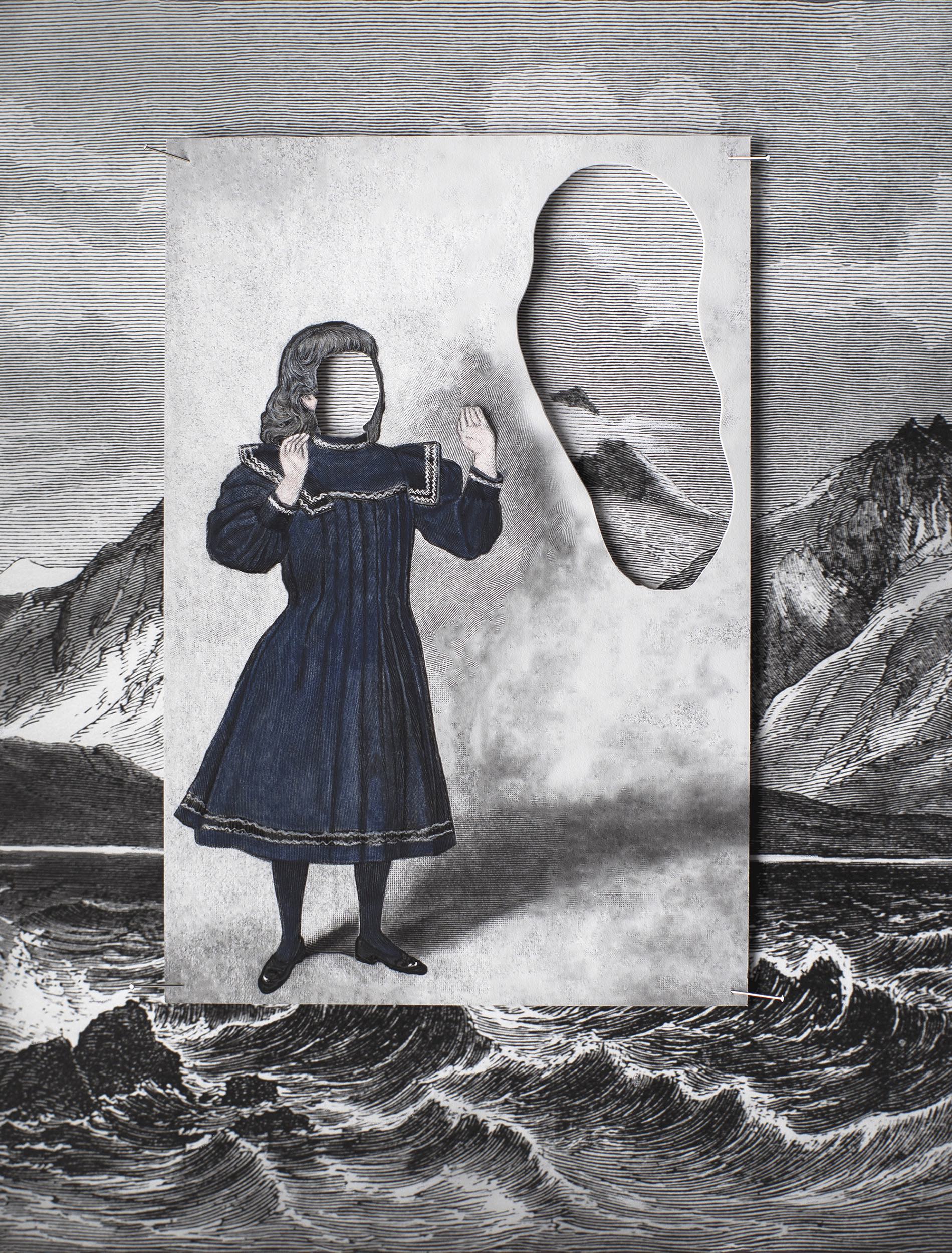Ulla Jokisalo, Lapsuuskuvasta, osa Kesytön luonto n:o 2, 2024, leikattu pigmenttimustevedos, akvarelliväri ja nuppineulat, uniikki teos, 44 x 32 cm kehyksineen
