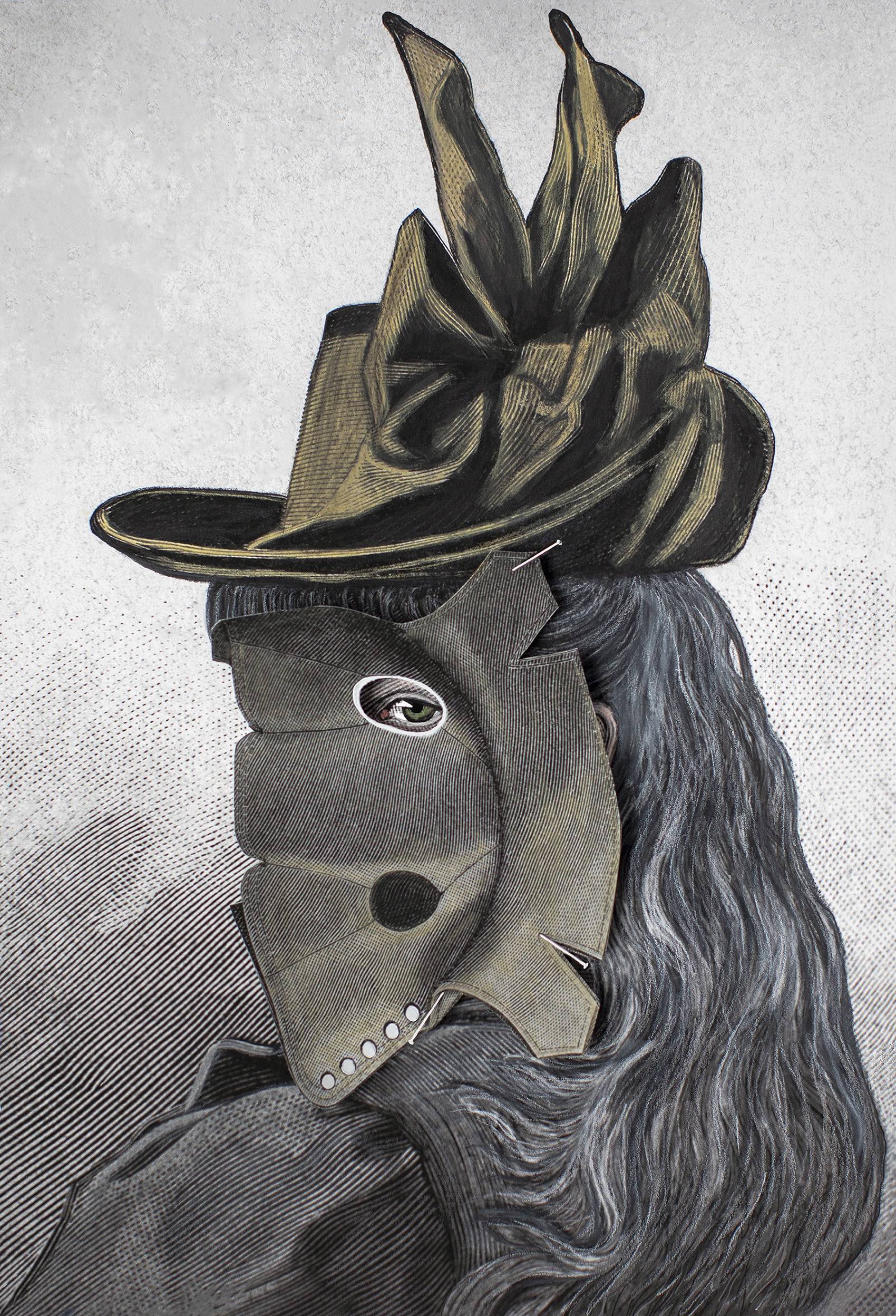 Ulla Jokisalo, Lapsuuskuvasto ,osa Kesytetty luonto n:o 1, 2024, leikattu pigmenttimustevedos, akvarelliväri ja nuppineulat,uniikki teos, 44 x 32 cm kehyksineen.