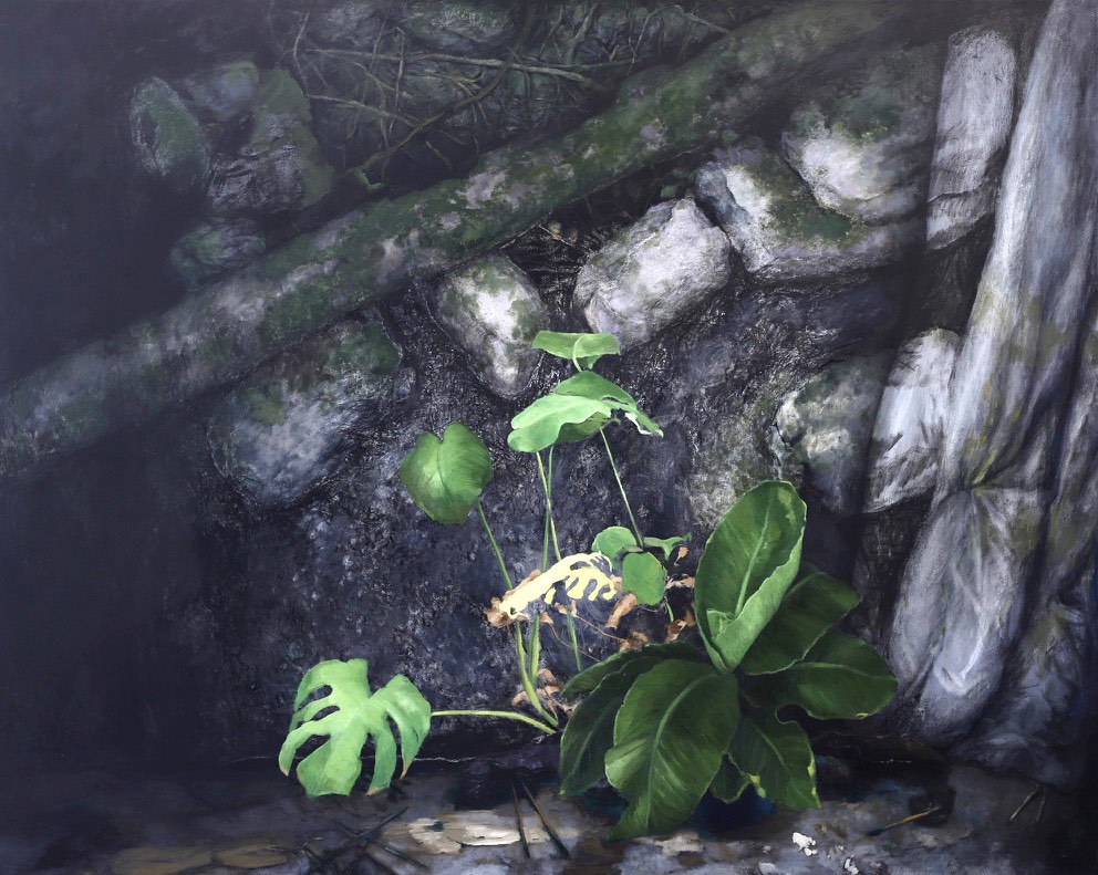 Peikonlehti ja banaanipuu työhuoneella, 2022-25, akryyli, öljy ja hiili kankaalle, 180 x 200 cm.